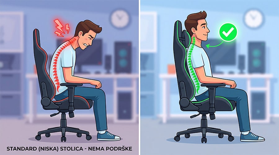 Visina naslona: naslon koji završava kod lopatica ne daje nikakvu cervikalnu (vratnu) podršku. Svaki put kad sagneš glavu napred ka monitoru, vučeš 5-7 kg glave bez oslonca.