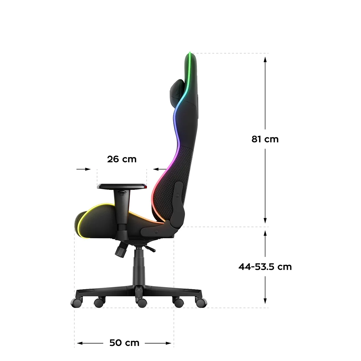 Traka u naslonu baca epic glow oko cele stolice. Bežični daljinski menja boje i modove (wave, pulse, static) dok USB kabl pije struju iz PC-ja ili power-banka u džepu ispod sedišta.
