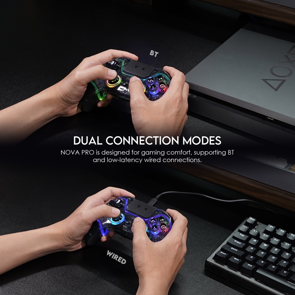 Nova Pro Solaris — poluprozračni feniks, svetleći kroz tvoj hodnik i igralište. Dual-Mode (Bluetooth 5.3 + žično), motion senzor, vibrantna vibracija, RGB svetlosni efekti, zamjenjivi sticks, programabilna čarolija — tvoj verni saveznik u svim svetovima.