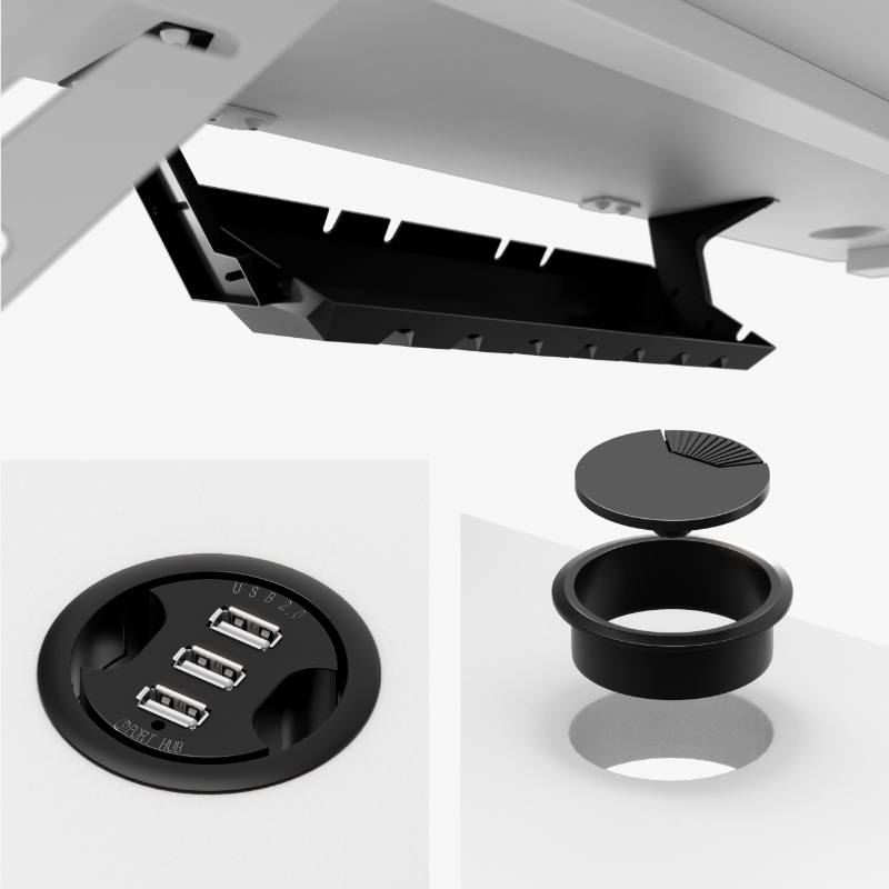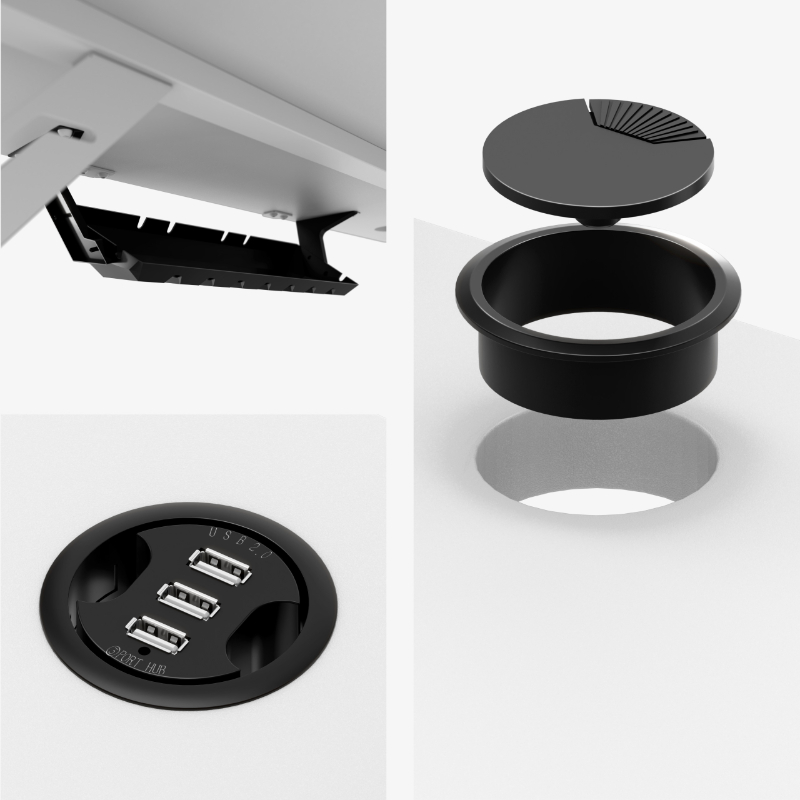 Pametna rešenja: U radnu površinu ugrađen je USB punjač (5V) smešten u otvoru za kablove, što omogućava jednostavno punjenje mobilnih uređaja bez dodatnih adaptera na stolu.