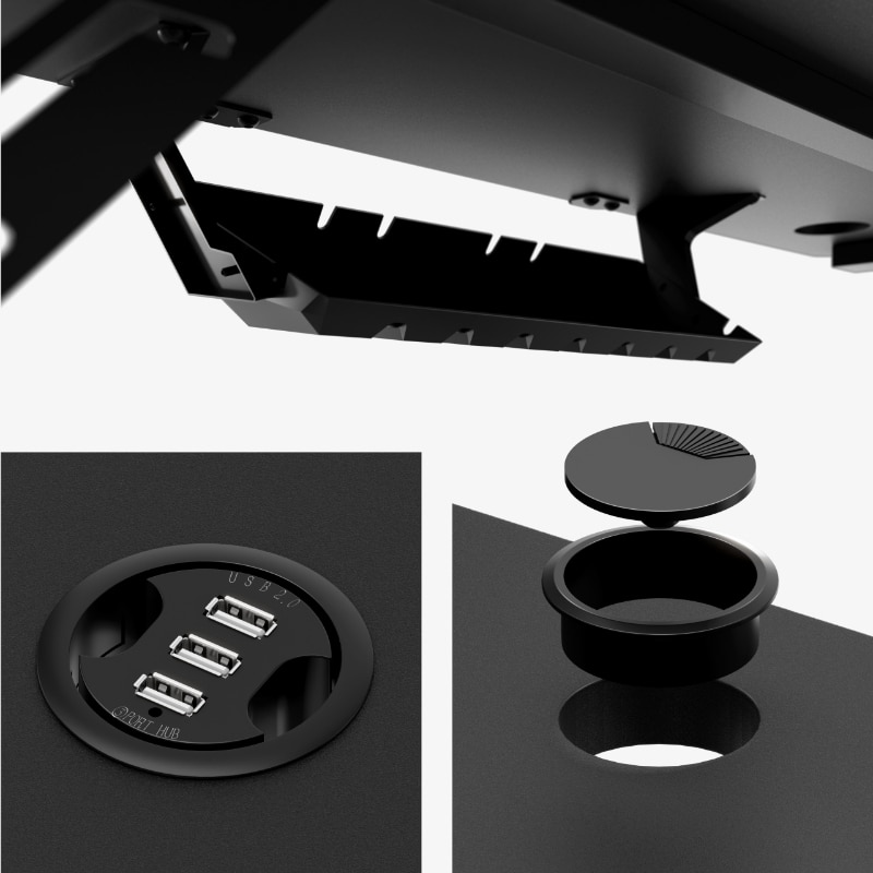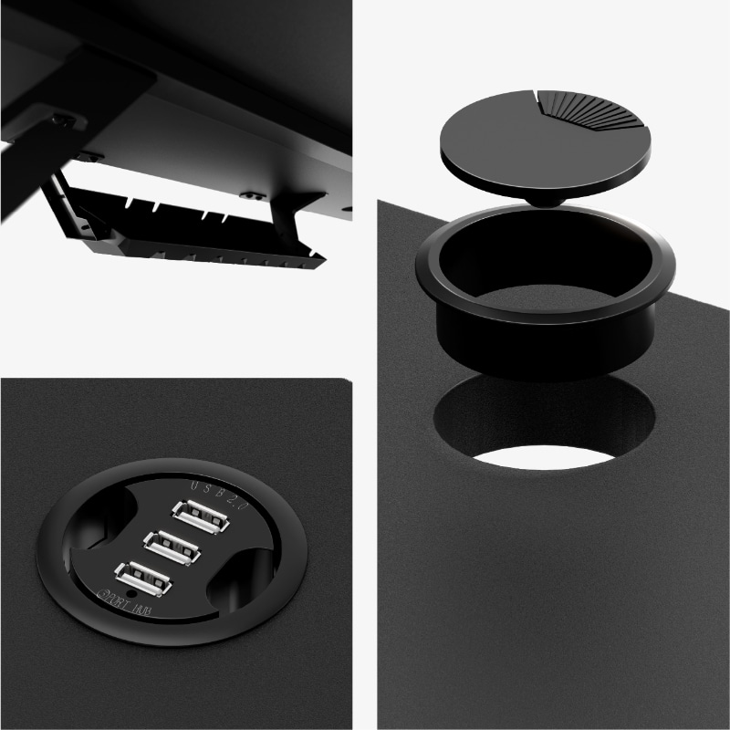 Pametna rešenja: U radnu površinu ugrađen je USB punjač (5V) smešten u otvoru za kablove, što omogućava jednostavno punjenje mobilnih uređaja bez dodatnih adaptera na stolu.