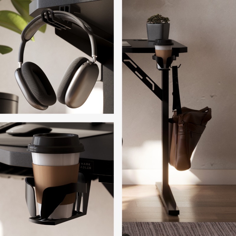 Dodatna oprema: Sto dolazi sa praktičnim držačem za čaše/flaše i kukama za slušalice i torbu/ranac, čime radna površina ostaje potpuno čista i prohodna.