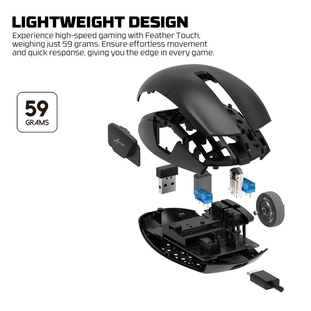 Dimenzije & težina (~114×65×39 mm, 59 g bez kablova) – izbalansiran za claw/fingertip grip, lebdi kroz mečeve kao pelikan u tišini.