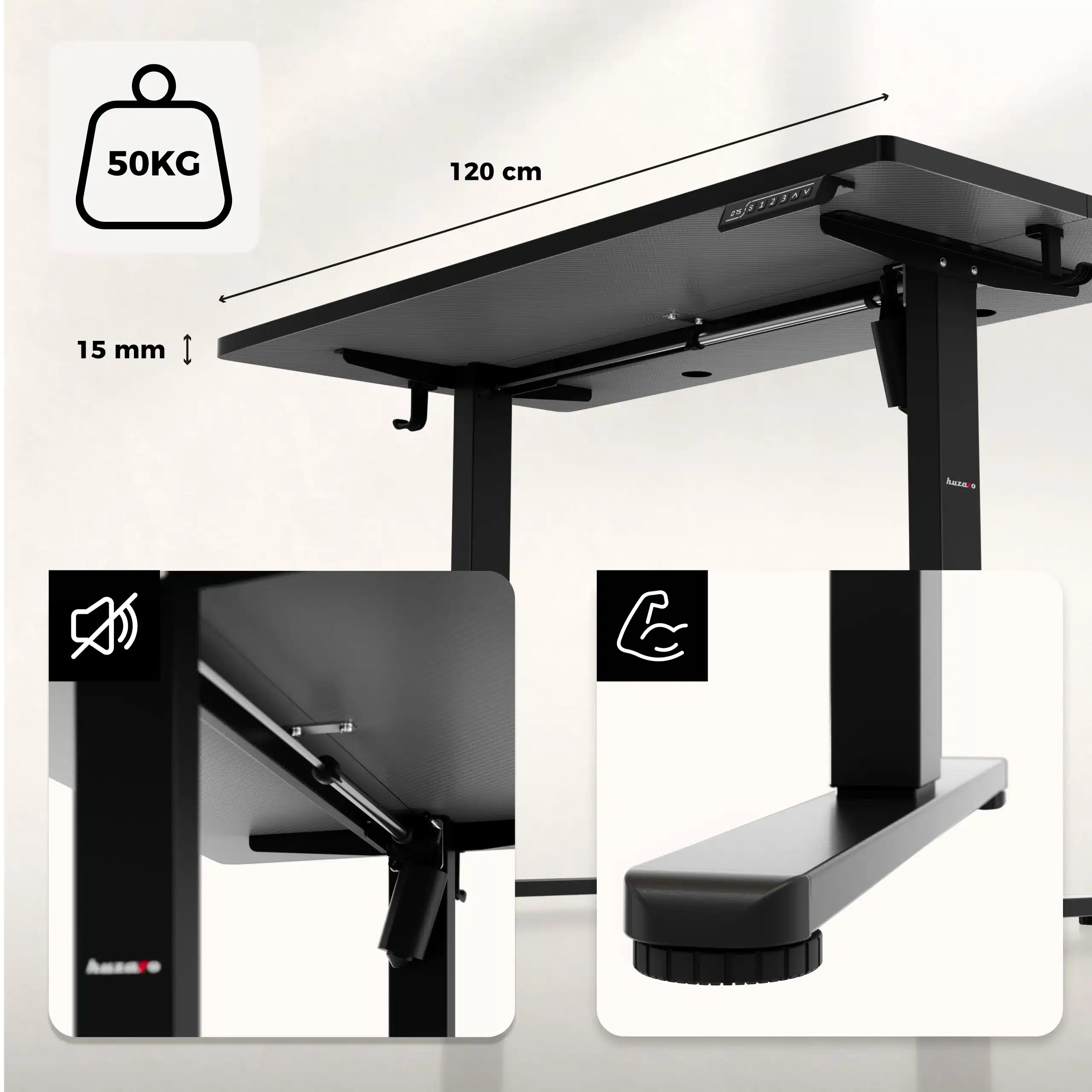 Metalni, ojačani ram + tihi električni pogon sa udarnom nosivošću do 50 kg. Regulacione stopice drže sto mirnim čak i na neravnom podu.
