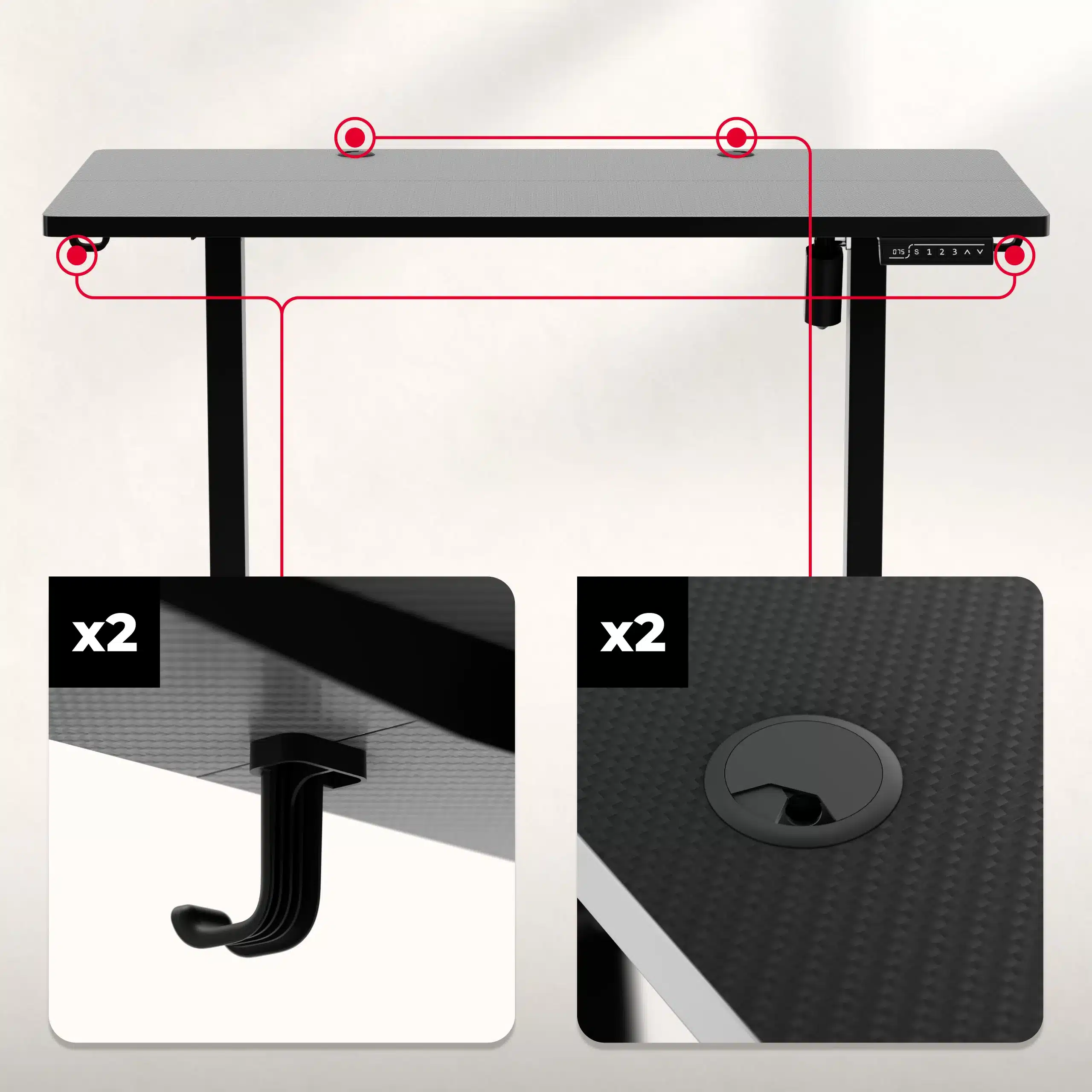 Mat tekstura inspirisana karbonskim vlaknima – lako se čisti i štiti ploču. Dve provodnice kriju instalaciju ispod površine, a dve bočne kuke čuvaju slušalice ili ranac uvek nadohvat ruke.