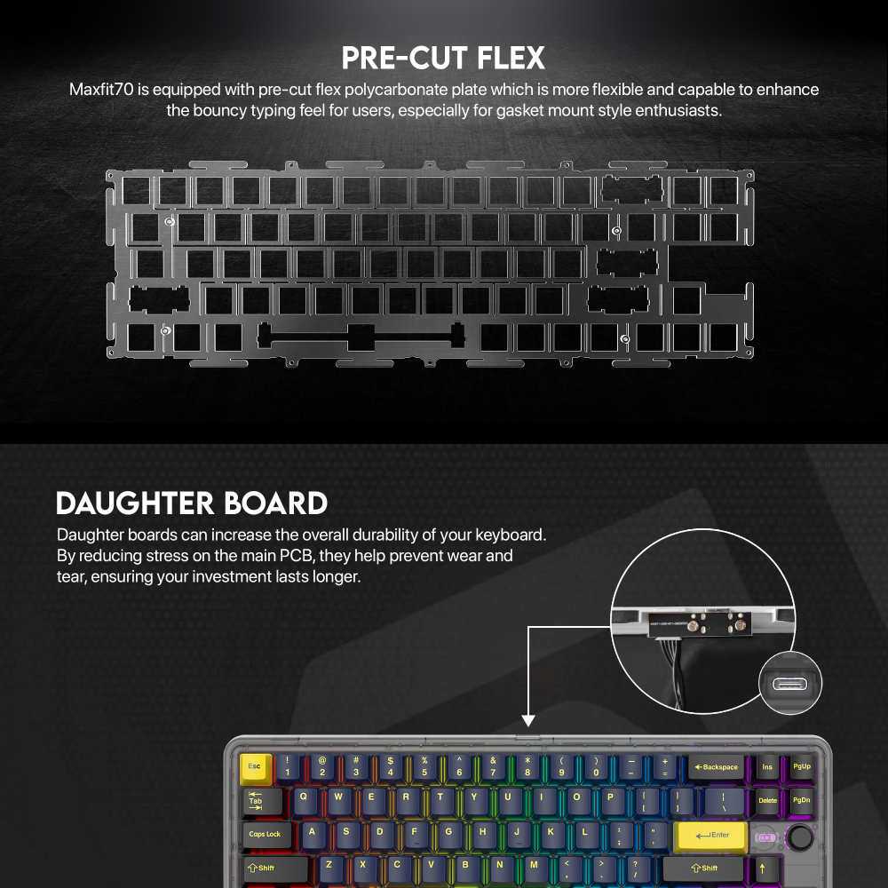 MaxFit70 London Tour je bežična (tri‑mode) mehanička tastatura sa 70 tastera (65 % layout + rotacioni točkić), opremljena žutim linearnim switch-evima, transparentnom retro gornjom pločom, RGB osvetljenjem u 22 moda, hot-swap podrškom i brzom StrikeSpeed Wireless vezom. Spoj retro stila, modularnosti i performansi za tvoj HQ setup.